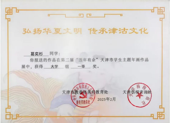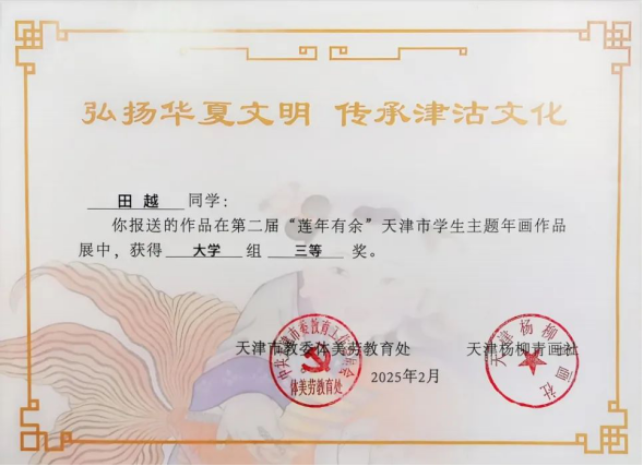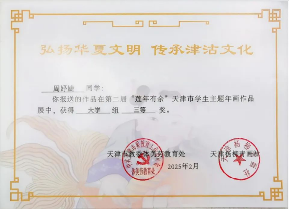近日,由天津市教育委员会与杨柳青年画社联合举办的“莲年有余”天津市学生主题年画作品展落下帷幕。此次活动中共收到来自16个区的598所中小学、38所高校报送的9068件作品,经专家评选,海运学子凭借对传统年画艺术的深刻理解和独特创新,最终5件作品入围并获得1个一等奖、4个三等奖,展现了同学们对传统文化的热爱和勇于探索创新的精神风貌。
