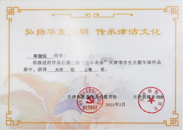 这份荣誉不仅是对获奖同学个人的认可,也是学院美育教育成果的有力彰显。在筹备和在作品准备的过程中,同学们深入研究传统年画的艺术特点,不断尝试创新。老师们为学生系统讲解了杨柳青年画的艺术特色和创作技法,从作品构思到创作细节,都给予了专业的建议,助力学生突破创作瓶颈,从生活和文化中汲取灵感。