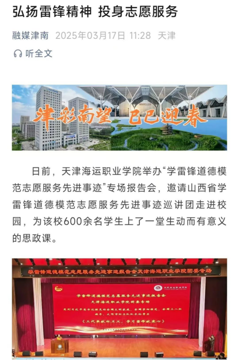 3月17日,津南融媒微信公众号发布文章《弘扬雷锋精神 投身志愿服务》,报道天津海运职业学院邀请山西省学雷锋道德模范志愿服务先进事迹巡讲团走进校园,举办“学雷锋道德模范志愿服务先进事迹”专场报告会,为学生上了一堂生动而有意义的思政课。