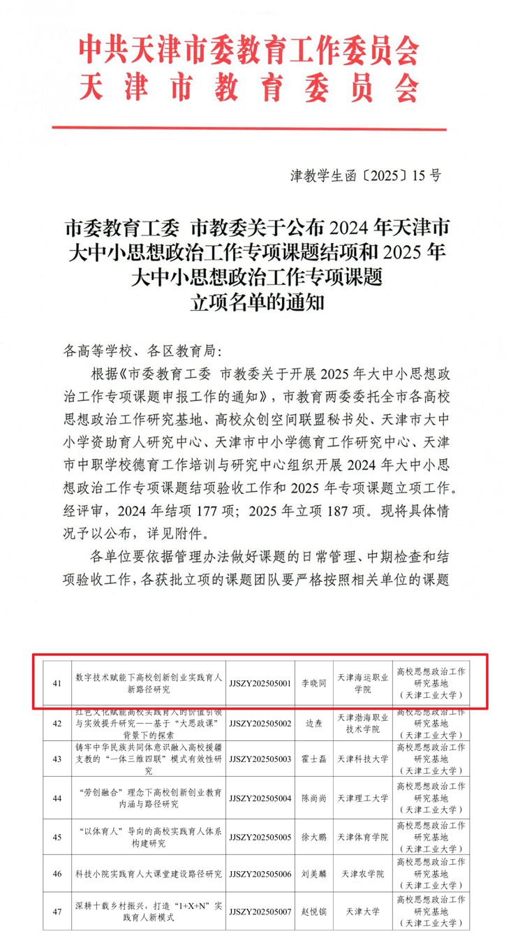 天津海运职业学院获批2025年天津市高校思想政治工作专项课题立项