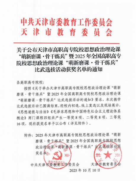 一等奖+2:思政课教师在2025年天津市高职高专院校思想政治理论课“萌新磨课·骨干练兵”比赛中获佳绩