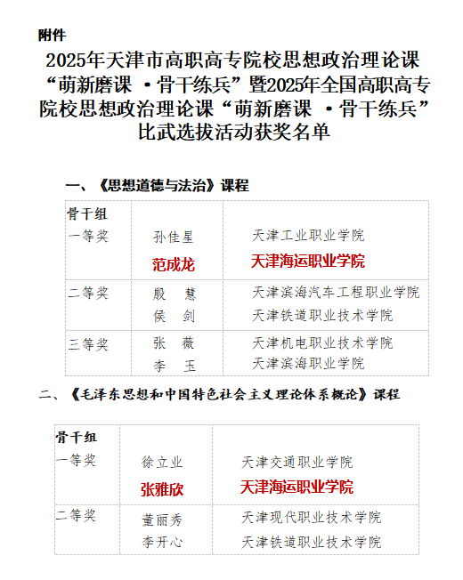 近日,市教育两委公布了2025年天津市高职高专院校思想政治理论课“萌新磨课·骨干练兵”获奖名单,学院思政课教师范成龙、张雅欣在骨干练兵比赛中荣获一等奖。