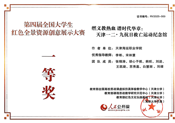近日,由教育部全国高校思政课虚拟仿真体验教学中心、教育部课程思政教学研究示范中心主办的第四届全国大学生红色全景资源创意展示大赛结果公布。马克思主义学院李彬、宋林慧两位老师指导的作品《燃义教热血谱时代华章》,斩获全国一等奖。创作团队由来自航海技术系、海洋工程装备系、信息工程系的张锦涛、胡心予祺、韩旺、刘进、王凯旋、苏秀嘉、白慧丽、刘绪等8名同学共同组建。