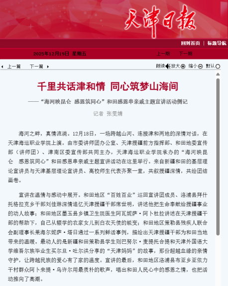 12月19日,《天津日报》刊发文章《千里共话津和情 同心筑梦山海间——“海河映昆仑 感恩筑同心”和田感恩串亲戚主题宣讲活动侧记》,报道由市委讲师团办公室、天津援疆前方指挥部、和田地委宣传部(讲师团)、津南区委宣传部共同主办,天津海运职业学院承办的“海河映昆仑 感恩筑同心”和田感恩串亲戚主题宣讲活动在天津海运职业学院举行。