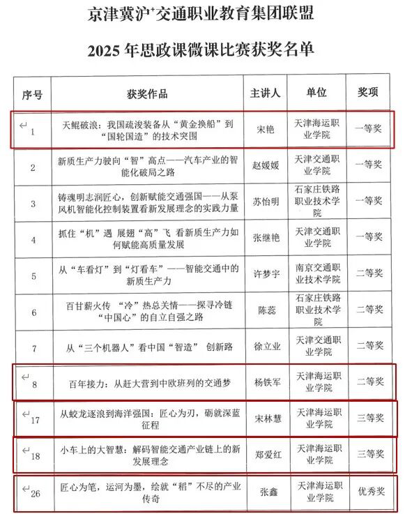 近日,在京津冀沪+交通职业教育集团联盟主办的“铸魂明志润匠心 德技双修育匠才”思政微课比赛中,天津海运职业学院马克思主义学院报送的5个作品紧扣国家海洋强国战略与交通行业发展,以鲜明主题与独特视角,从众多参赛课程中脱颖而出,荣获一等奖1项、二等奖1项、三等奖2项和优秀奖1项。