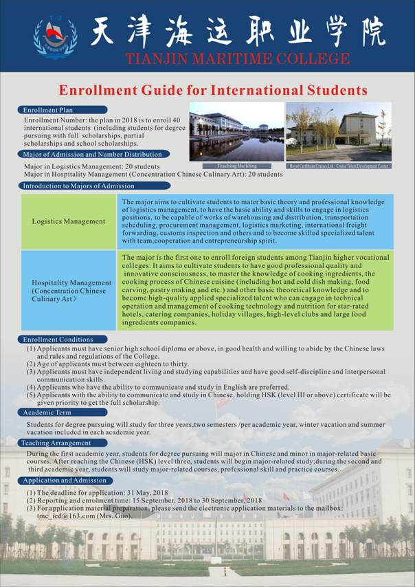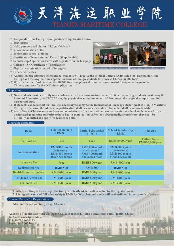 注意事项 Application Procedure and Instructions: 1. 新学年为9月入学。申请人应于5月底前,提交申请材料。 The new academic year begins in September. Applicants are asked to send the completed Form before the end of May for the new academic year. 2. 将填写好的申请表,照片(2寸)电子版和学历证书扫描件发送至邮箱(tmc_ied@163.com)。 Send the completed application form, with photo (2-inch) in digital version and educational certificate be scanned copy to the mailbox (tmc_ied@163.com). 3. 我院在收到按上述指定日期提交的申请材料后,将向申请人寄发来华签证申请表(JW202 表)和入学通知书。 After receiving the application materials by the date specified above, we will send the Visa Application Form (JW202) and the Letter of Admission. 4. 申请人可持JW202表、入学通知书和《外国人体格检查记录》(学习期限超过6个月的学生) 到中国驻贵国使(领)馆办理来华学习签证(X1签证),学习期在6个月以内的可申请X2签证。 With the Visa Application Form (JW202) and the Letter of Admission along with the completed Physical Examination Report (if the duration of study is more than 6 months), the applicant should apply to the Chinese Embassy (or Consulate) for the X1 visa (student’s visa), or for the X2 visa if the duration of study is less than 6 months. 5. 学生应按入学通知书规定的时间来学院报到。入境后10天之内应申办外国人居留证,否则 将受到公安部门的处罚。 The student is required to register at Tianjin Maritime College during the time specified in the Letter of Admission and go through the formalities for applying for residence card within 10 days after arriving in China. The student shall be fined by the local Public Security Bureau if s/he fails to do so within the said period. |