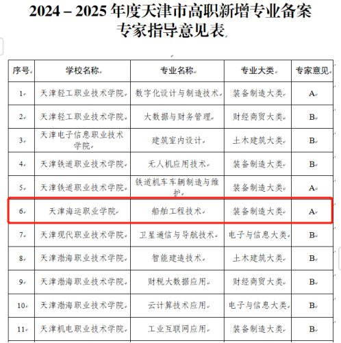 近年来,天津市海洋装备领域发展迅速,船舶工业、海工平台与特种工程船等海洋装备高端化、绿色化、智能化程度走在全国前列。天津海运职业学院积极对接产业需求,增设船舶工程技术专业,服务我市海洋装备从“天津制造”向“天津智造”转变。经学院调研申报,市教委组织专家指导、综合评议,船舶工程技术专业在全市26个新增专业中,成为5个A档专业评价之一,顺利通过我市2025年度高职教育新增专业备案。