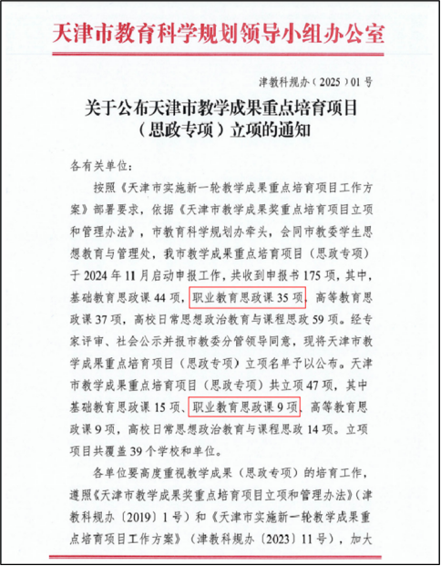 近日,市教育科学规划领导小组办公室公布天津市教学成果奖重点培育项目(思政专项)立项结果,思政教学部赵秀花教师团队申报的《故事赋能四课联动四环相扣——高职思政课教学改革与实践》从35项申报项目中脱颖而出,获批立项。