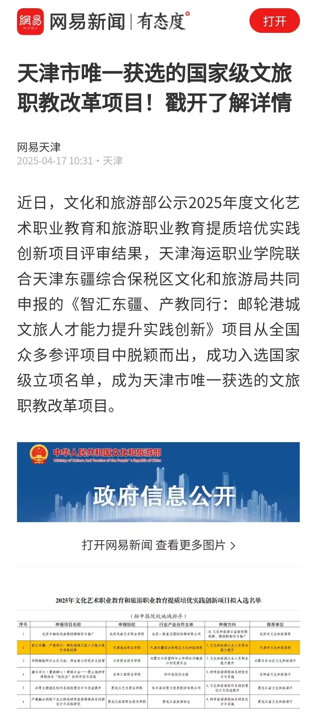 【媒体看海运】网易新闻报道天津海运职业学院获批文化和旅游部职教改革项目