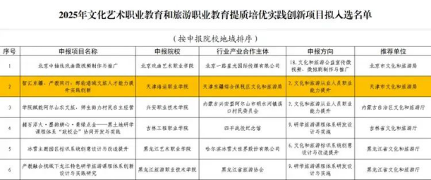 近日,文化和旅游部公示2025年度文化艺术职业教育和旅游职业教育提质培优实践创新项目评审结果,天津海运职业学院联合天津东疆综合保税区文化和旅游局共同申报的《智汇东疆、产教同行:邮轮港城文旅人才能力提升实践创新》项目从全国众多参评项目中脱颖而出,成功入选国家级立项名单,成为天津市唯一获选的文旅职教改革项目。