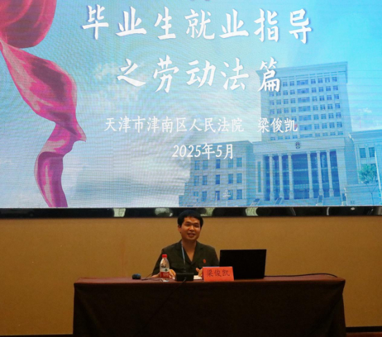 在与会师生的共同见证下,安文杰和陈昀共同为“天津市津南区人民法院驻天津海运职业学院法官工作站”揭牌,李晓燕和王军签署了双方合作共建协议。仪式上还播放了由津南区人民法院根据真实案件改编的微电影作品《蓝色潮落》。法官梁俊凯以“毕业生就业指导之劳动法篇”为题作了专题讲座。