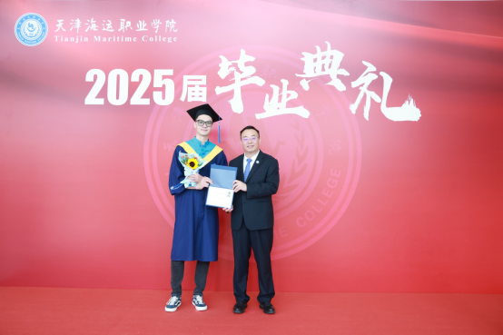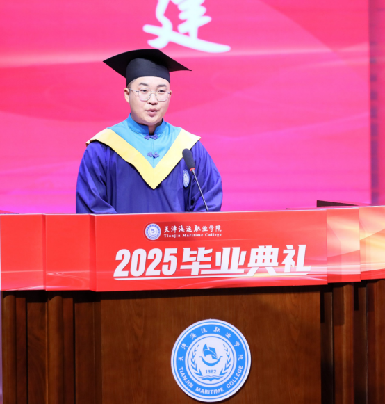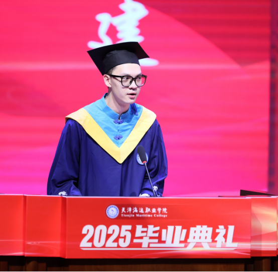 天津市大学生年度人物提名奖获得者、工程技术系理化测试与质检技术(无损检测技术)专业学生王铭鑫,邮轮旅游系旅游管理专业乌兹别克斯坦籍留学生王马克西姆晋平分别代表2025届毕业生、2025届留学生发言,他们细数了三年求学的难忘时刻,表达了对母校及老师的依依不舍和由衷谢意。尤其是王马克西姆晋平同学娓娓道来的“中国缘”“海运情”,以真实而生动的故事展示了学院国际化办学成效,让我们看到了“人类命运共同体”闪亮的青春注脚。