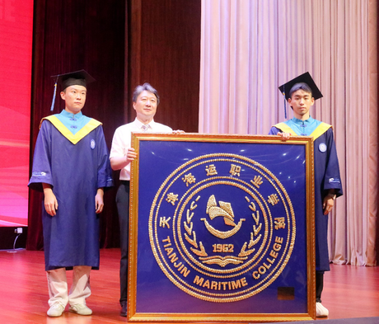 毕业生代表向母校赠送以校服扣精心制作的校徽纪念品。党委书记陈昀代表学院接受镶嵌着毕业生们海运青春记忆的纪念品。
