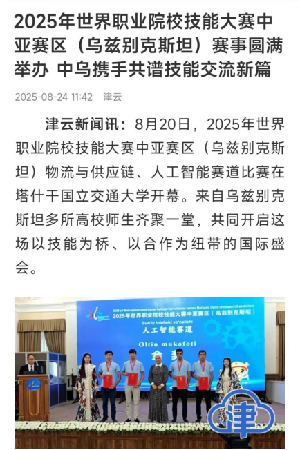 8月20日,2025年世界职业院校技能大赛中亚赛区(乌兹别克斯坦)物流与供应链、人工智能赛道比赛在塔什干国立交通大学开幕。津云发表文章《2025年世界职业院校技能大赛中亚赛区(乌兹别克斯坦)赛事圆满举办 中乌携手共谱技能交流新篇》,对大赛进行了报道。