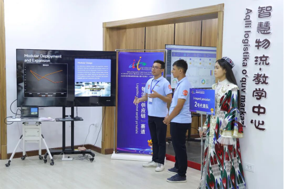 参赛选手在2025年世界职业院校技能大赛中亚赛区(乌兹别克斯坦)物流与供应链赛道比赛现场介绍项目设计方案。