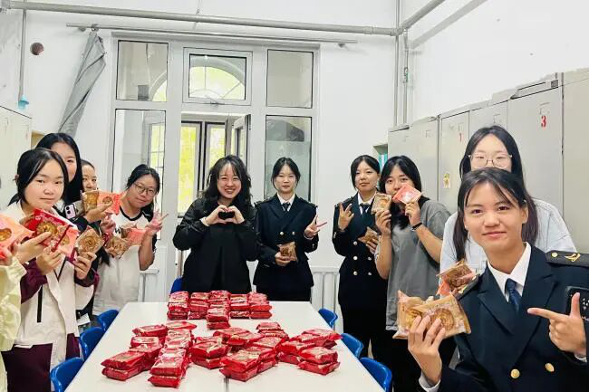 值班辅导员化身“社区守护者”,开展“三进”暖心行动——进宿舍、进活动、进心田。在社区服务站设立“校徽月饼领取点”,让“海运版”定制月饼承载“舌尖上的团圆”;启动“温情速递”和“敲门送福”等专属服务,确保留校同学“一个都不能少”的温暖传递。同学们感慨:“学院送的不只是月饼,更让我体会到了家的味道!”
