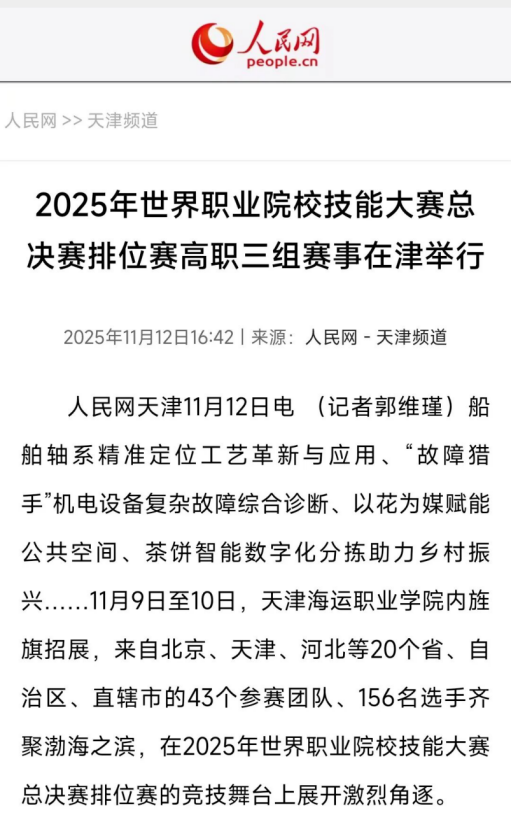 11月12日,人民网发布文章《2025年世界职业院校技能大赛总决赛排位赛高职三组赛事在津举行》,报道2025年世界职业院校技能大赛总决赛排位赛高职三组赛事在天津海运职业学院举行。