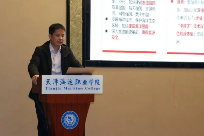 专家报告环节,大会邀请了多位专家学者分享最新研究成果。天津海运职业学院院长于忠武作题为《深耕蓝色沃土培育时代海匠——天津海运职业学院育人实践与专业群建设探索》的专题报告,分享了学院立足海运、海港、海工三大领域,服务国家海洋强国战略的实践经验与专业群建设成果;天津大学焊接与先进制造研究所副所长程方杰、海洋石油工程股份有限公司研发技术部部门经理雷震名、交通运输部海事局船舶技术规范专家委员会秘书陈梦华分别围绕焊接制造技术、海洋工程技术发展历程、绿色能源动力船舶技术等前沿热点领域作了精彩报告。