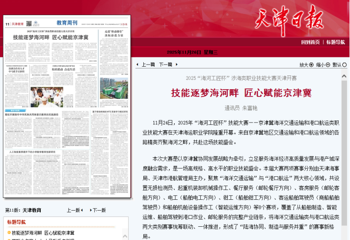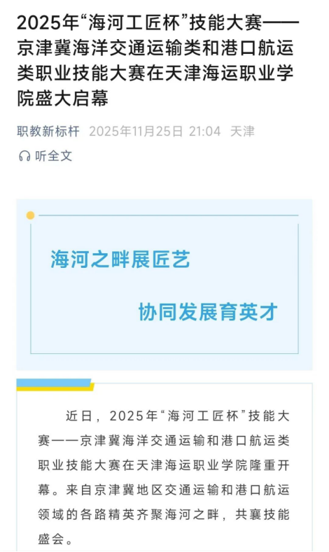 11月24日,2025年“海河工匠杯”技能大赛——京津冀海洋交通运输和港口航运类职业技能大赛在天津海运职业学院隆重开幕。来自京津冀地区交通运输和港口航运领域的各路精英齐聚海河之畔,共赴这场技能盛会。