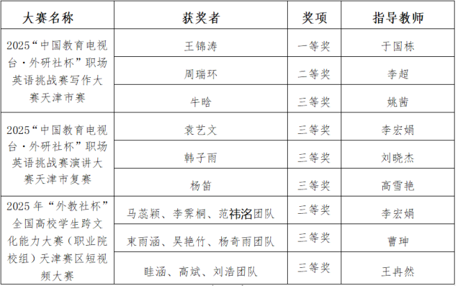 近日,2025年“外教社杯”全国高校学生跨文化能力大赛(职业院校组)天津赛区短视频大赛、2025“中国教育电视台・外研社杯”职场英语挑战赛写作大赛天津市赛、2025“中国教育电视台・外研社杯”职场英语挑战赛演讲大赛天津市复赛相继落幕。学院基础教学部牵头组织选拔的学生选手、团队在三项赛事中发挥出色,荣获1项一等奖、1项二等奖、7项三等奖。