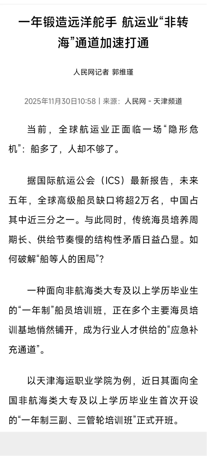 一种面向非航海类大专及以上学历毕业生的“一年制”船员培训班,正在多个主要海员培训基地悄然铺开,成为行业人才供给的“应急补充通道”。