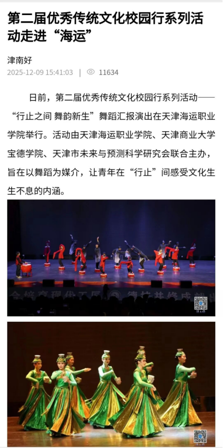 12月5日,由天津海运职业学院、天津商业大学宝德学院、天津市未来与预测科学研究会联合主办的第二届“优秀传统文化校园行”系列活动之“行止之间 舞韵新生”暨天津商业大学宝德学院影视与舞蹈系2022级汇报演出在天津海运职业学院举行。津南融媒对此次活动进行了报道。