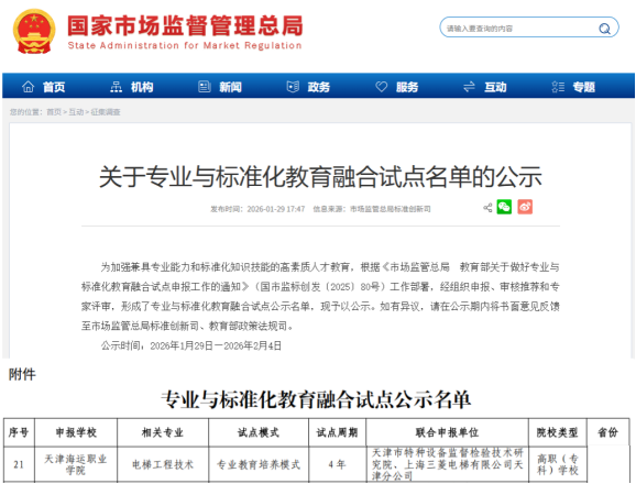 近日,市场监管总局、教育部公示专业与标准化教育融合试点名单,天津海运职业学院电梯工程技术专业凭借深厚的办学积淀与创新的融合模式成功入选。此次试点由学院牵头,联合天津市特种设备监督检验技术研究院、上海三菱电梯有限公司天津分公司共同申报,标志着学院在产教融合、标准化人才培养领域迈出关键步伐,跻身国家级改革试点行列。