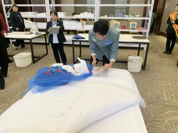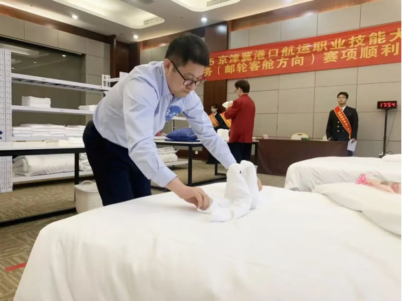 大赛聚焦邮轮产业的核心服务场景,设置“邮轮客舱中式铺床”与“邮轮客舱夜床创意服务”两大核心模块,全面考察选手的操作娴熟度、服务规范性与艺术创造性。赛场内,来自京津冀三地的16名技术能手同台竞技,在限定的时间内,将一方素布幻化为平整如镜的床榻,将寻常毛巾折叠成栩栩如生的艺术之花。方寸之间的激烈角逐,不仅是速度与精准的较量,更是对“精益求精、追求卓越”工匠精神的生动诠释。选手们沉稳专注的表现、富有巧思的夜床设计,充分展现了新时代邮轮技能人才的精湛技艺与职业风采。
