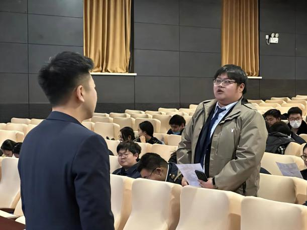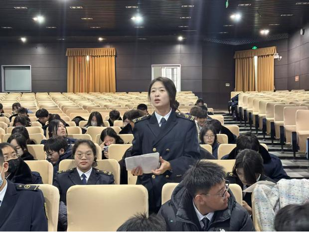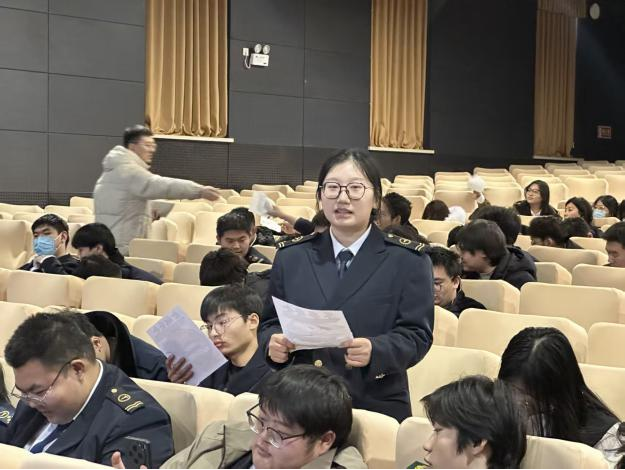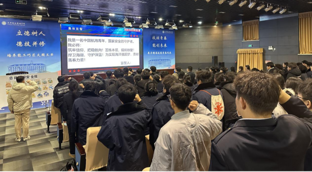 随后,同学们立足所学专业,把澎湃心潮化为守护国家安全的青春承诺:“我驾驶的每一海里,守护的都是国家经济的海上命脉。”“我检修的每一个零件,夯实的都是海洋强国最坚实的根基。”……宣言虽简,却饱含海运学子的时代担当。课程最后,全体师生庄严宣誓:“捍卫海疆,守护深蓝,为建设海洋强国贡献青春力量!”誓言铮铮响彻会场,把整场活动推向高潮。