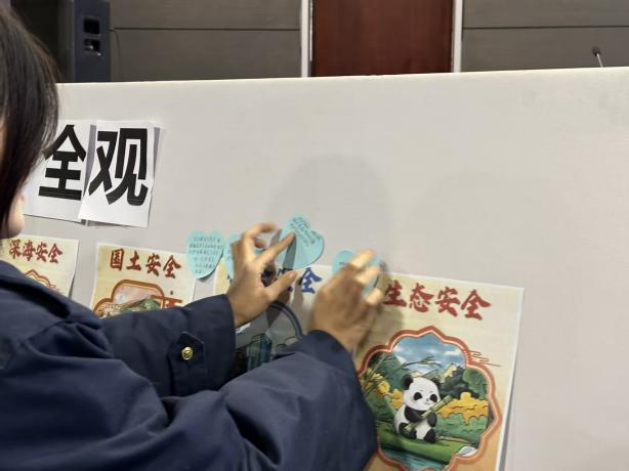 观影结束后,在张鑫、范成龙和宋艳三位教师的引导下,同学们首先完成“光影中的思政课”随感任务卡,分享影片中最触动人心的场景与细节,情感在笔尖流淌,思考于无声中萌芽。随后的“深海拼图:共绘总体国家安全观”研讨环节,各小组围绕影片情节展开热烈讨论,把国家安全的内涵从政治、军事等传统领域拓展至经济、科技、生态、网络、海外利益等重点领域的非传统安全。教师适时介入,系统阐释总体国家安全观“以人民安全为宗旨”的根本立场,解读海洋安全在社会主义现代化强国建设中的战略意义,引导学生构建起立体、系统的国家安全认知体系。