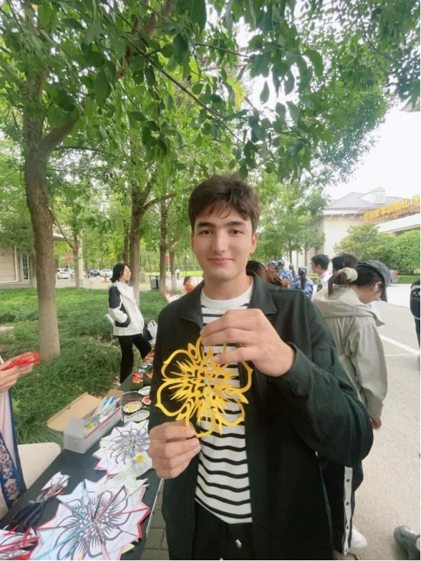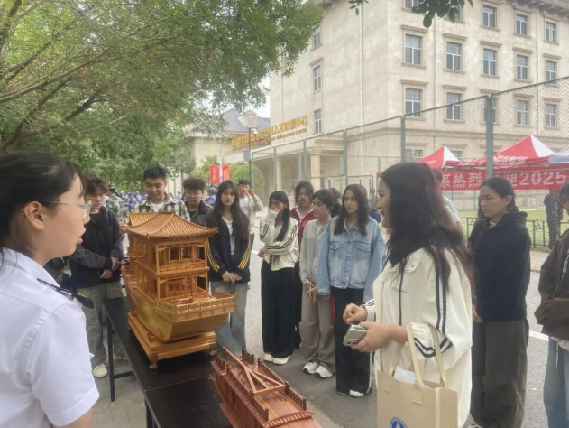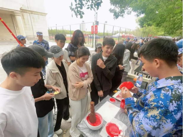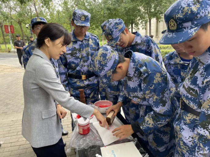 在非遗展示体验区,杨柳青木版年画、泥人张彩塑、田氏船模、无同竹编、温派面塑、于氏掐丝珐琅釉彩画、宁氏漆艺镶嵌漆器、麦秸画、模具彩塑、传统刻瓷等展位瞬间被大一新生们“包围”。非遗传承人现场展示非遗技艺,讲解项目传承历史,为学生们献上独特的美育“开学第一课”。活动现场,同学们打卡非遗市集,近距离感受中华优秀传统文化的独特魅力。非遗美育的沉浸体验与“五育融合”的迷彩军营相向而行,让青年学子在美美与共中厚植文化自信。学院留学生、联合培养和田班学生也被吸引而来,纷纷感叹优秀传统文化的博大精深。