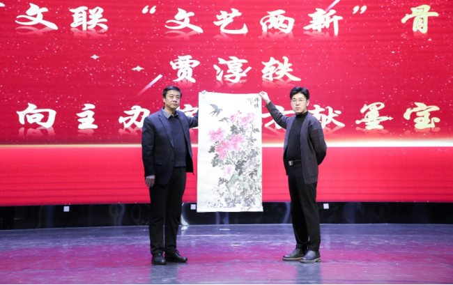 仪式上,天津市青年美术家协会理事贾淳轶先生向我院赠送墨宝,由王军副书记代表接受,预祝演出圆满成功。最后,李润兰会长郑重宣布演出正式开始。