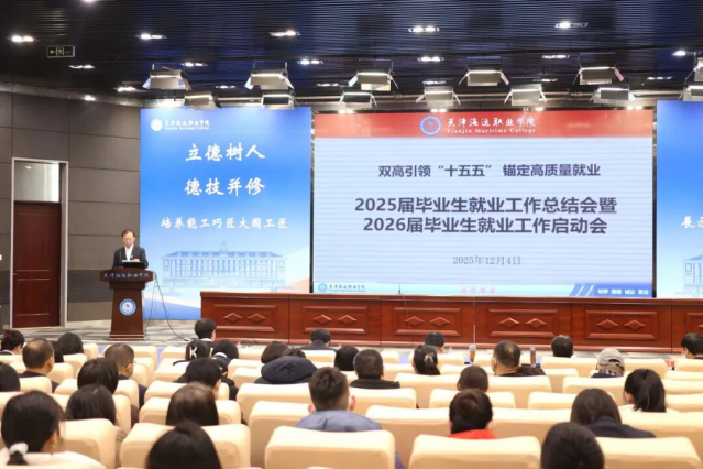 12月4日上午,天津海运职业学院2025届毕业生就业总结会暨2026届毕业生就业启动会在办公楼报告厅召开。学院领导班子全体成员,党委学生工作部、教务处等职能部门负责人,各教学系领导班子成员、辅导员、教研室教师代表,以及招生就业处全体工作人员参加会议。会议由招生就业处处长吴楠主持。