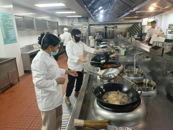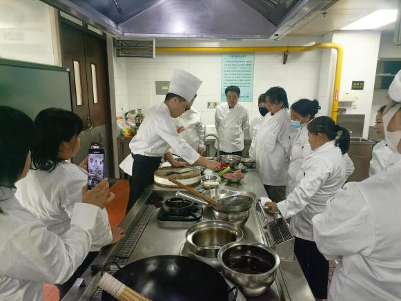 此次培训邀请了经验丰富、厨艺精湛的邮轮旅游系中式烹调高级技师宋中辉进行授课,他采取理论与实操相结合的方式,面对面、手把手地从处理食材、烹制等过程向学员教授银芽鸡丝、宫保虾球和干烧鱼等10余种精品炒菜的制作流程和方法,着力强化学员实操能力,切实助力其技能提升。