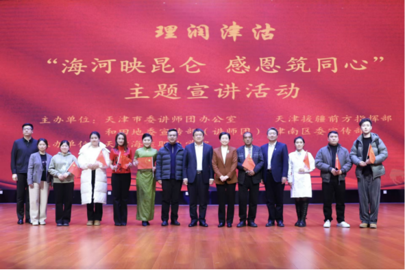 最催人泪下的是新疆和田策勒县学生则巴努尔·麦提托合提与天津外国语大学维吾尔族毕业生买尔旦·吐尔洪分别讲述的“天津妈妈”的暖心故事。他们用真挚的话语,勾勒出超越血缘的亲情守护,让跨越民族的爱心有了家的温度,不少师生热泪盈眶,现场掌声此起彼伏、久久不息。宣讲尾声,和田地区洛浦县布亚乡亚依力干村群众阿卜来提·乌许尔用最质朴的歌声,深情抒发和田人民对天津人民的感恩之情,将整场活动的氛围推向顶点。