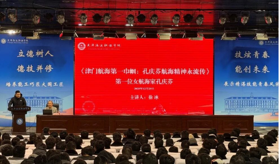 12月25日,天津海运职业学院关工委联合院团委、航海技术系举办“中华民族首位女航海家孔庆芬”专题讲座。此次活动特邀深耕孔庆芬事迹研究二十年的徐冰老师担任主讲,面向航海技术系400余名师生开展讲座,旨在通过航海先驱的感人事迹,强化学生的职业信念,培育新时代航海人才。