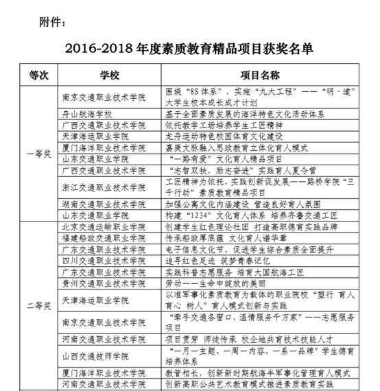 10月23日,中国交通职教分会素质教育委员会《关于表彰2016-2018年度素质教育精品项目的决定》公示评选结果,我院《龙舟运动特色校园体育文化建设》荣获一等奖。
