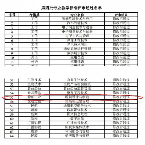2020年6月6日,教育部行业职业教育教学指导委员会工作办公室在国家开放大学会议中心,召开了第二次专业教学标准评审会。我系派教学副主任马志超和游艇教研室主任马喜仲参加答辩,通过现场汇报该标准修订情况、专家提问等答辩环节,专家组提出最终修订意见。2020年6月8日,我系收到《第四批专业教学标准评审通过名单》通知,我系牵头研制开发的《高等职业学校游艇设计与制造专业教学标准》通过专家审核。