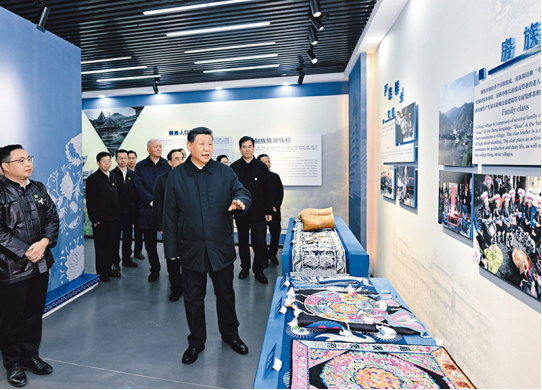 2025年3月17日至18日,中共中央总书记、国家主席、中央军委主席习近平在贵州考察。这是17日下午,习近平在黔东南州黎平县肇兴侗寨侗族文化展示中心考察。 新华社记者 谢环驰/摄