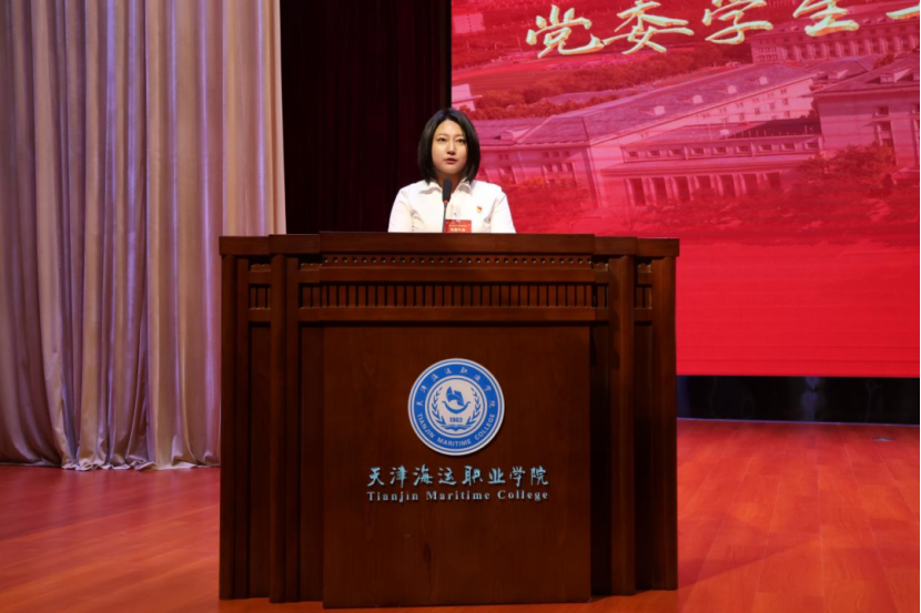 2025年6月30日,天津海运职业学院第七次学生代表大会在学院报告厅隆重召开,党委学生工作部(学生处、人民武装部)部长、学院团委书记王洋在开幕式讲话。