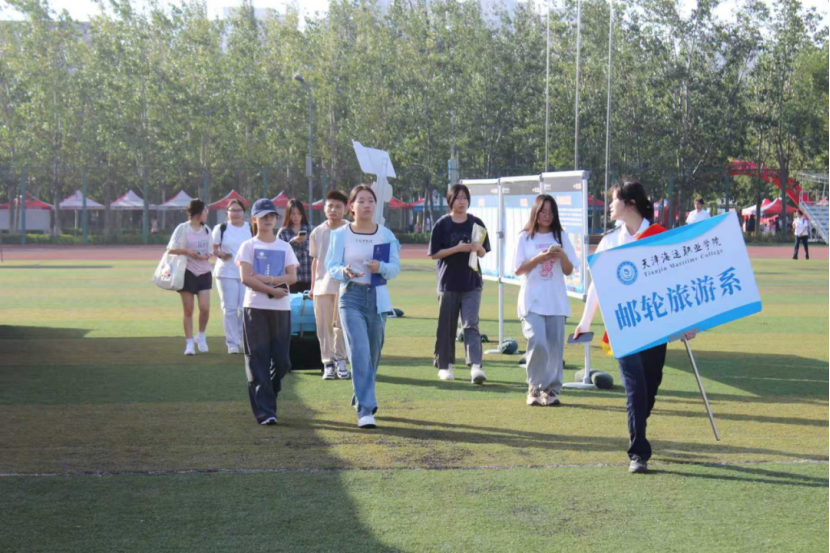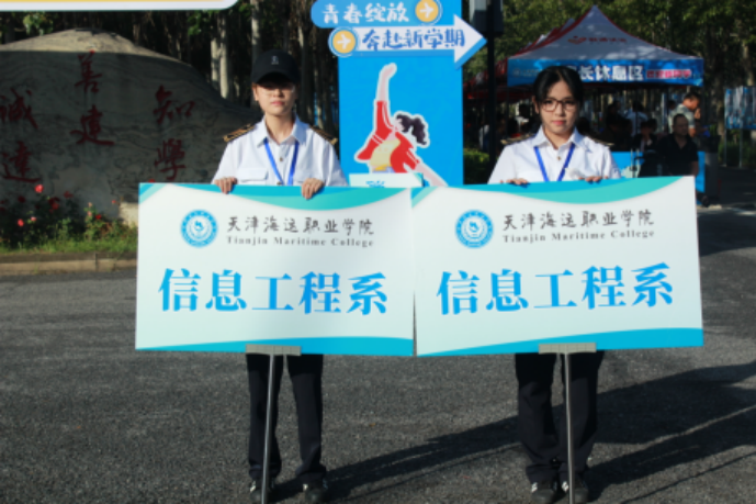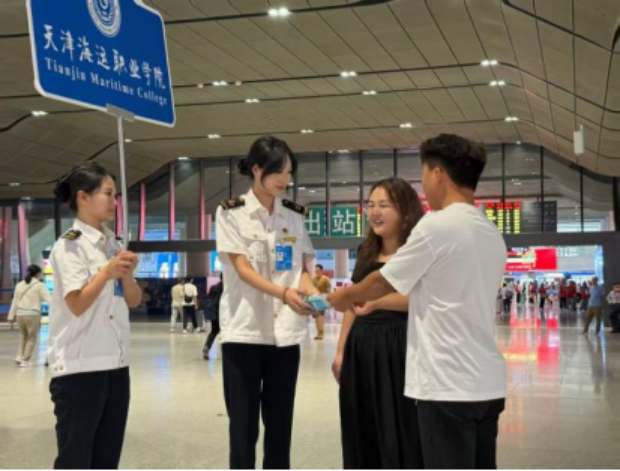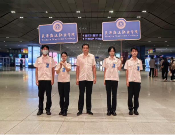 早上六点,院团委的学生志愿者们出发前往天津西站、天津站等人流密集的站点。他们手持“天津海运职业学院”欢迎牌,以笑容和周到的服务,为新生指引方向。