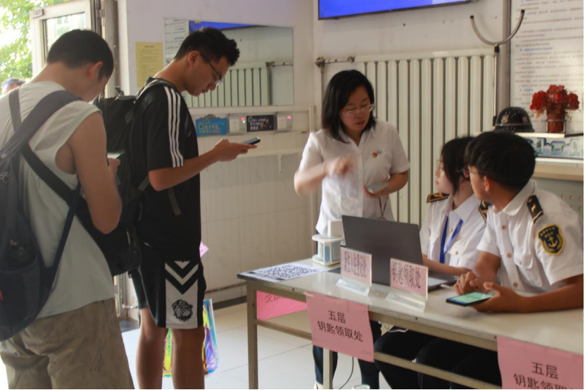 志愿者通力协作,为新生提供全方位保障:绿色通道志愿组为家庭经济困难学生提供贴心服务;交费处志愿组协助负责老师高效便捷完成缴费工作;宿舍志愿组为新生发放宿舍钥匙等;迎新志愿组全力值守,确保新生入校安全有序。