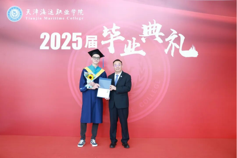 天津市大学生年度人物提名奖获得者、工程技术系理化测试与质检技术(无损检测技术)专业学生王铭鑫,邮轮旅游系旅游管理专业乌兹别克斯坦籍留学生王马克西姆晋平分别代表2025届毕业生、2025届留学生发言,他们细数了三年求学的难忘时刻,表达了对母校及老师的依依不舍和由衷谢意。尤其是王马克西姆晋平同学娓娓道来的“中国缘”“海运情”,以真实而生动的故事展示了学院国际化办学成效,让我们看到了“人类命运共同体”闪亮的青春注脚。